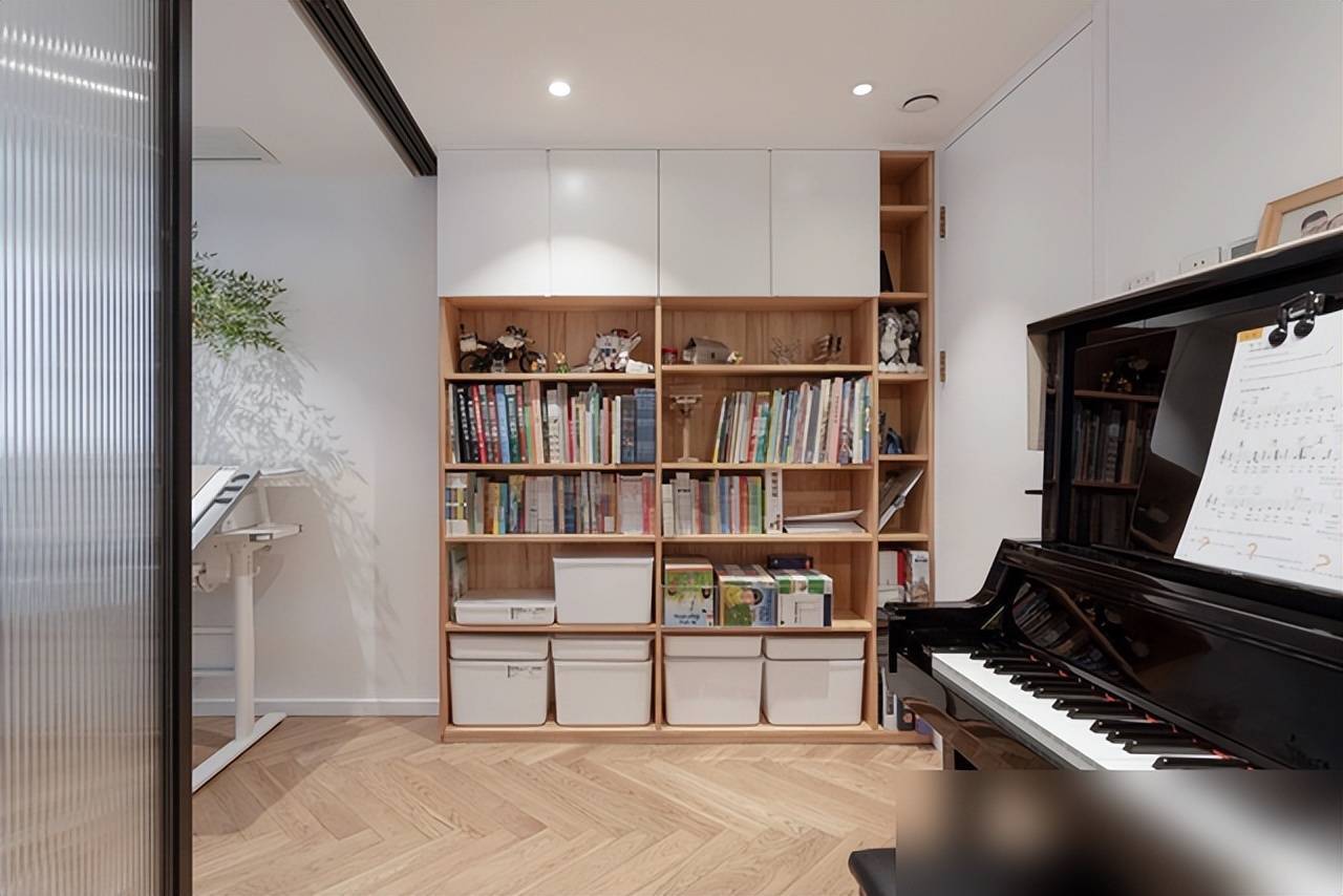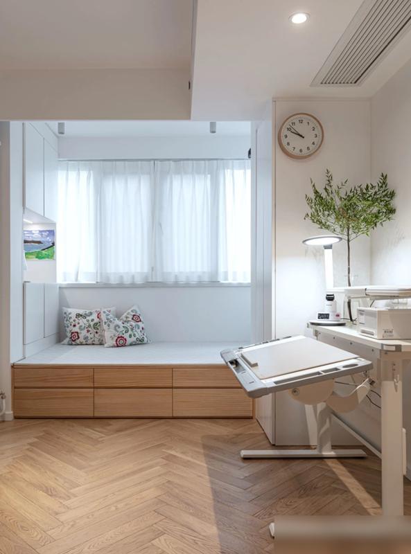 儿童房的设计更是精妙绝伦,三联动移门一关,瞬间变为两间,与主卧相连,直接形成三室布局,灵活多变如同搭积木。榻榻米兼具床与储物功能,升降书桌可随孩子身高调整,衣柜用撑杆就能改变高度,家具皆可移动,从幼儿园到中学都无需重新装修。