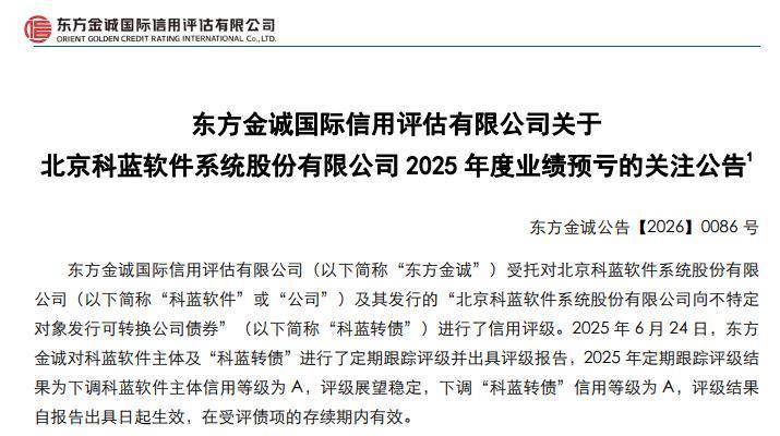 据公告,2025年6月24日,东方金诚对科蓝软件主体及“科蓝转债”进行了定期跟踪评级并出具评级报告,2025年定期跟踪评级结果为下调科蓝软件主体信用等级为A,评级展望稳定,下调“科蓝转债”信用等级为A,评级结果自报告出具日起生效,在受评债项的存续期内有效。