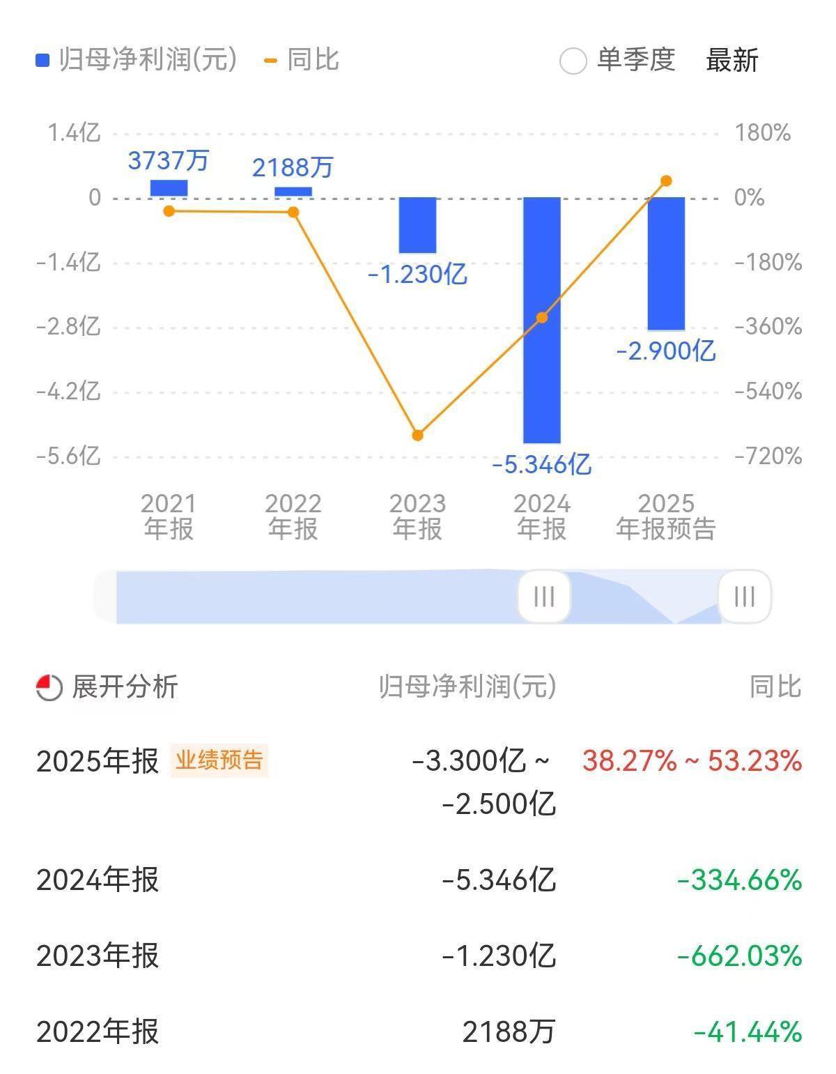 根据科蓝软件近期发布的业绩预告,预计2025年归母净利润亏损2.5亿元至3.3亿元,上年同期亏损5.35亿元;扣非净利润亏损2.53亿元至3.33亿元,上年同期亏损5.39亿元。值得注意的是,这将是公司连续第三年亏损,3年累计亏损金额将超9亿元。